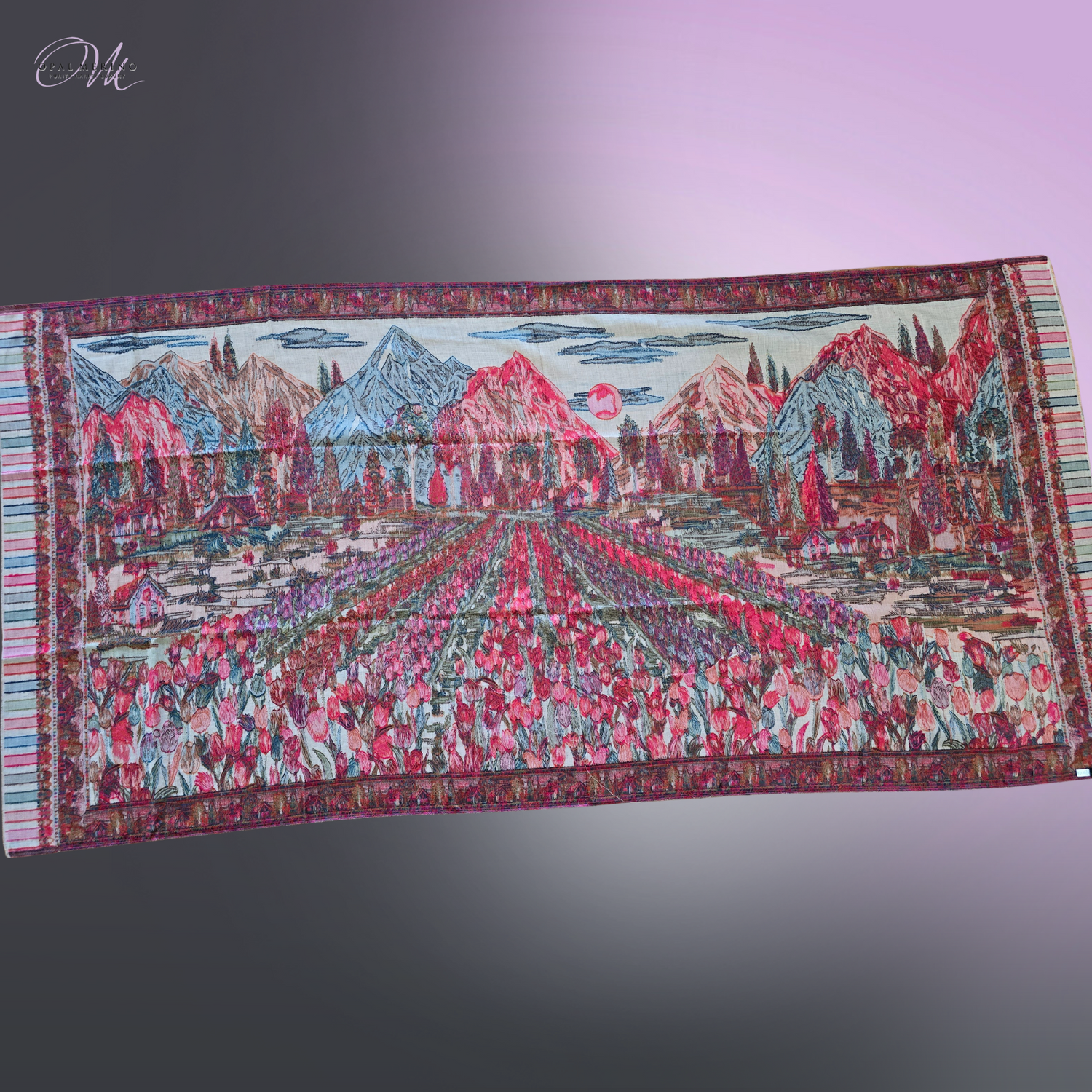 The Design Is Inspired From A Show That I Been Participating In, 'Floriade' In The City Of Canberra. The Style Of Weaving Is An Ancient Art Called Kani, This Creates Texture On The Reverse Side Where The Yarns Are Popping, Creating A Tapestry Effect. A Landscape Design With Pink, Blue, Red, Green, Pastel Orange With Hints Purple. The Border Depicts The Country Side In Miniature. The KanI Loom Is A Light Weight Merino Shawl Produced As A Limited Edition, A Collectors Must Have.